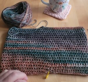Wenn die Mütze so hoch ist, wie du willst, also etwa 21 bis 28 cm, kannst du als letzte Runde noch feste Maschen häkeln.