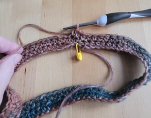 Wenn die Mütze so hoch ist, wie du willst, also etwa 21 bis 28 cm, kannst du als letzte Runde noch feste Maschen häkeln.