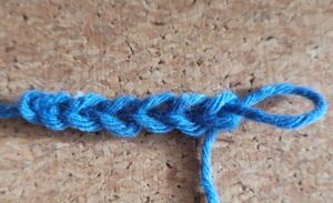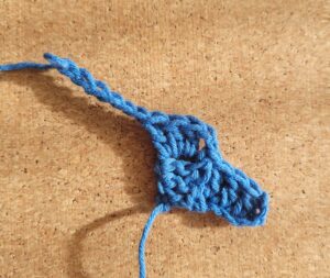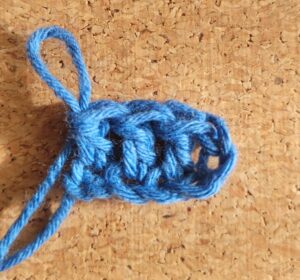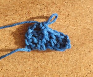 Schlage 6 Luftmaschen an und häkle dann in die drittletzte, zweitletzte und letzte Luftmasche von der Nadel aus gesehen je 1 Stäbchen.