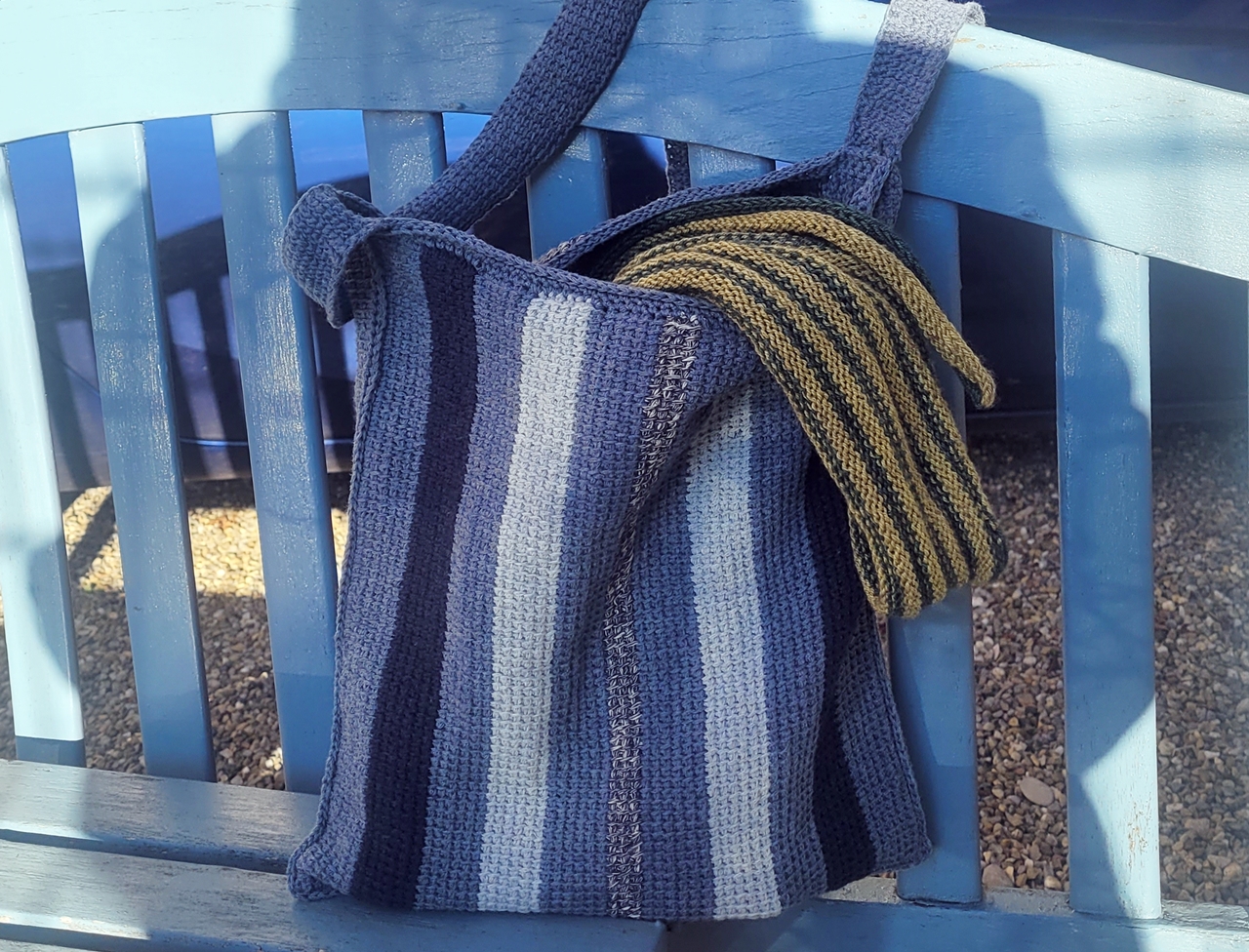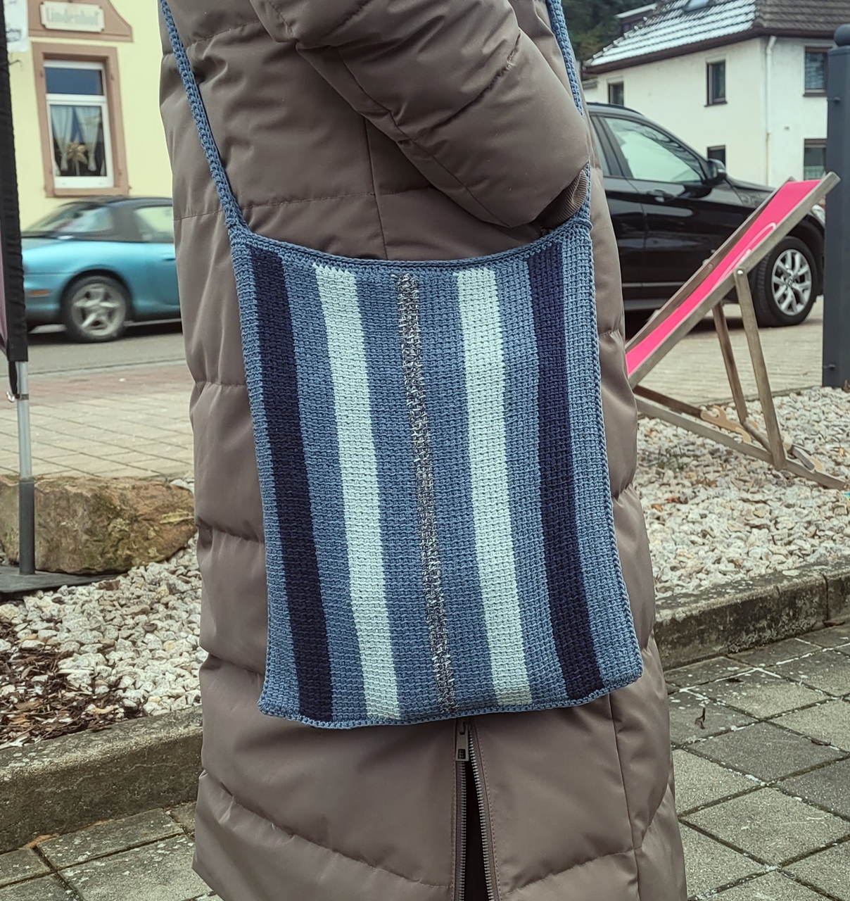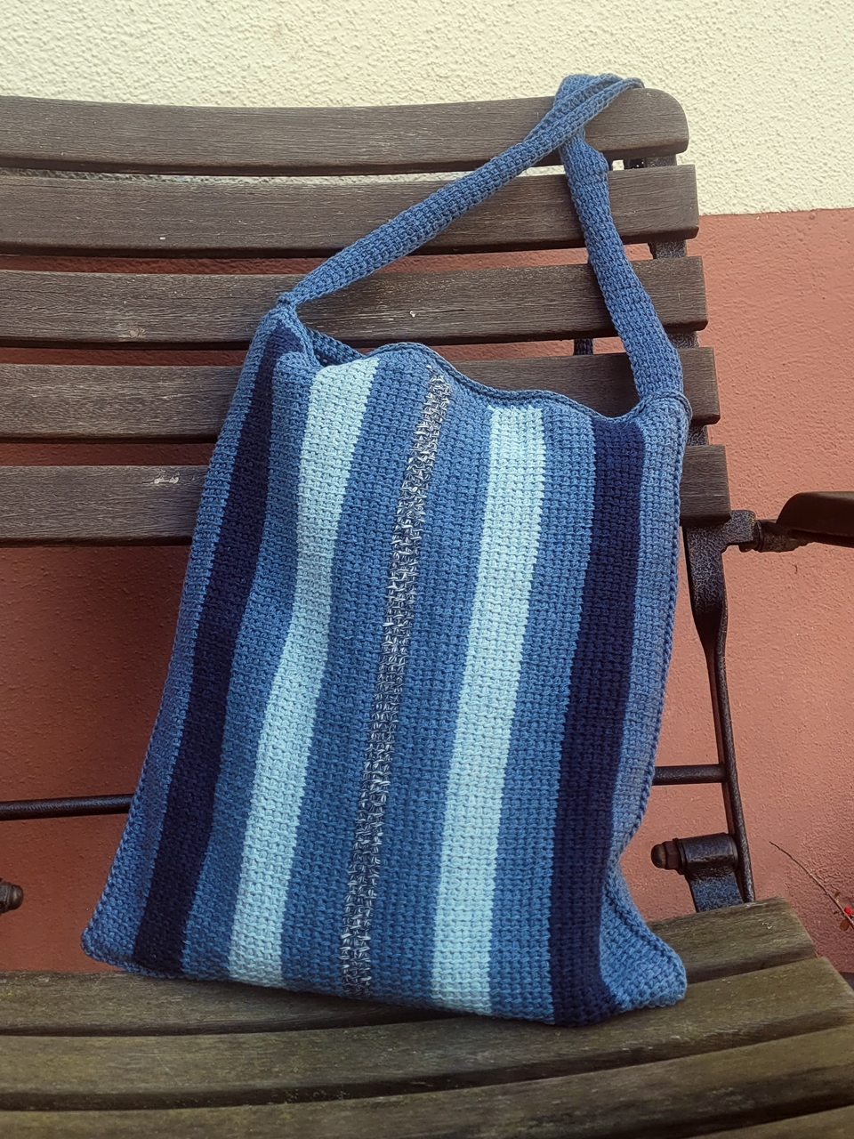 Anleitung für eine Umhängetasche im tunesischen Grundstich aus recyceltem Jeans Garn