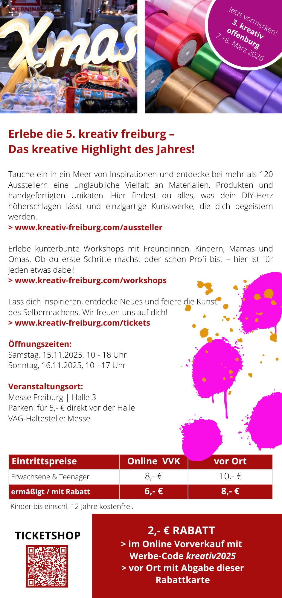 Ich nehme Teil an der Kreativ Freiburg und würde mich freuen, euch dort begrüßen zu dürfen.